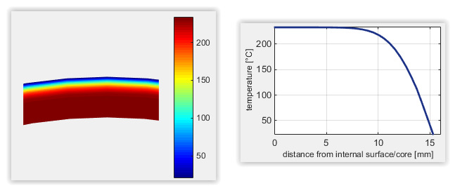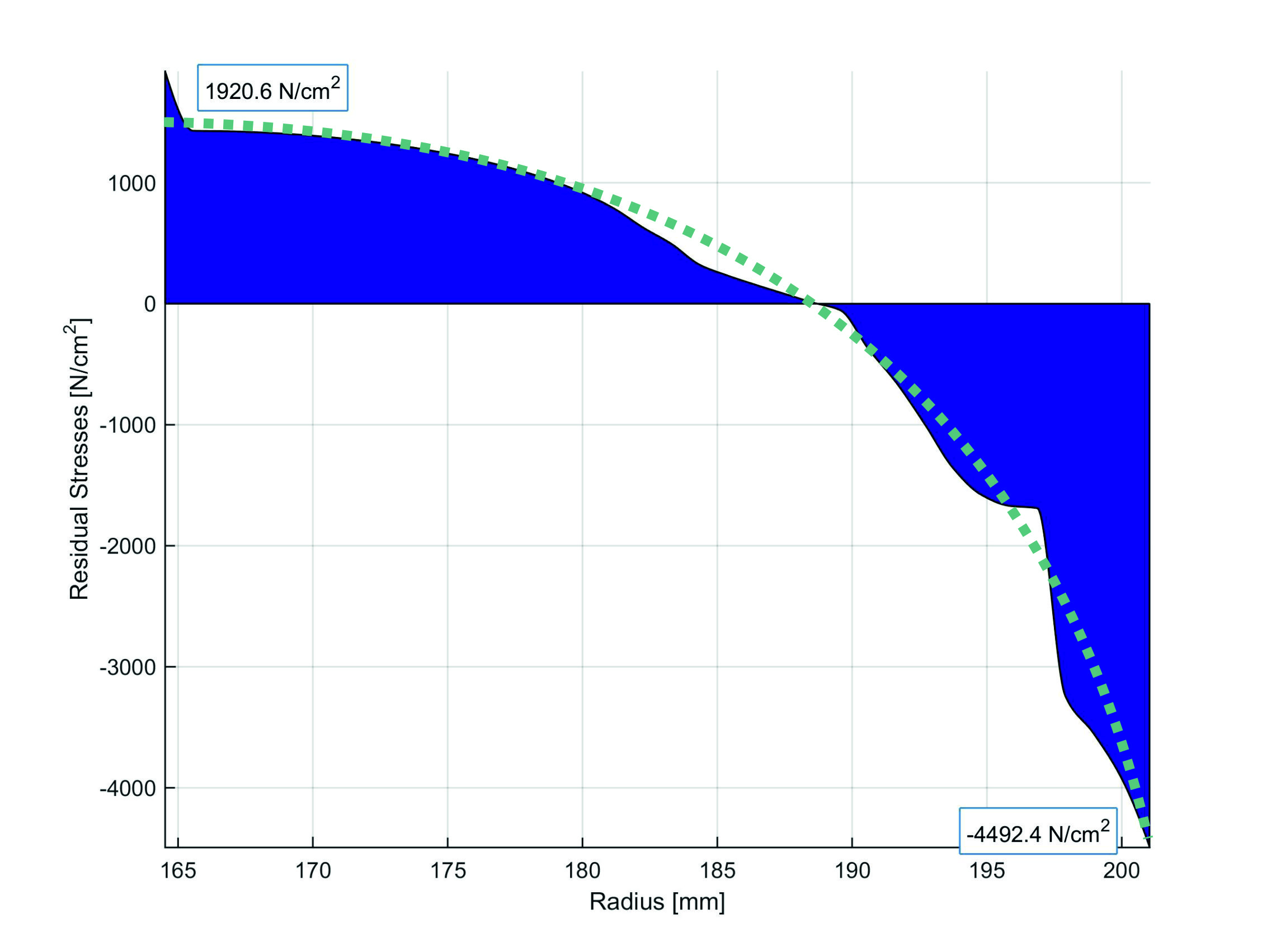 It is obvious that this linear residual stress profile represents a simplified assumption. In reality, residual stress profiles are formed which show a non-linear course, as shown, for example, in the following figure from a simulation: