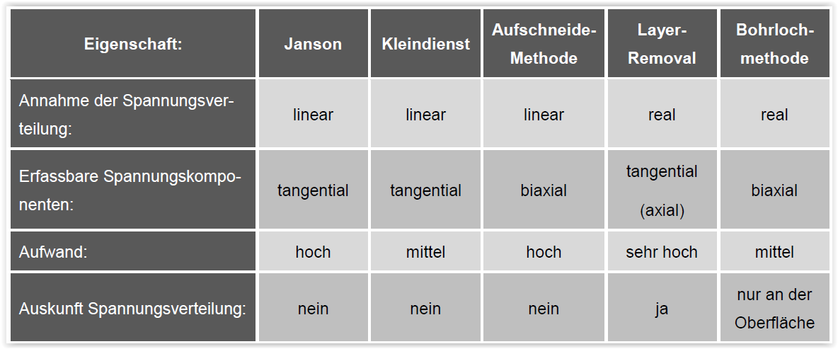 Um tangentiale Eigenspannungen in Kunststoffrohren zu messen, wird häufig die so genannte Janson-Methode angewendet. Sie ist verhältnismäßig weit verbreitet, jedoch existieren auch noch andere Verfahren. Die folgende Tabelle zeigt eine Auflistung der wichtigsten in der Literatur beschriebenen Verfahren: