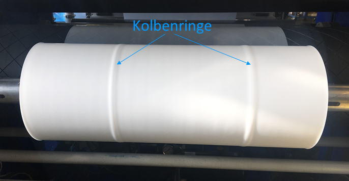 Ein weiterer Vorteil ist die Realisierbarkeit einer sehr gleichmäßigen Wanddickenverteilung durch eine sehr gleichmäßige Austrittgeschwindigkeit der Schmelze aus dem Werkzeug über den Spaltumfang. Dadurch lassen sich Dickstellen oder Dünnstellen im Produkt vermeiden, die ihrerseits wiederum zu weiteren Problemen, wie etwa Kolbenringen bei Folien führen können, siehe Abbildung.