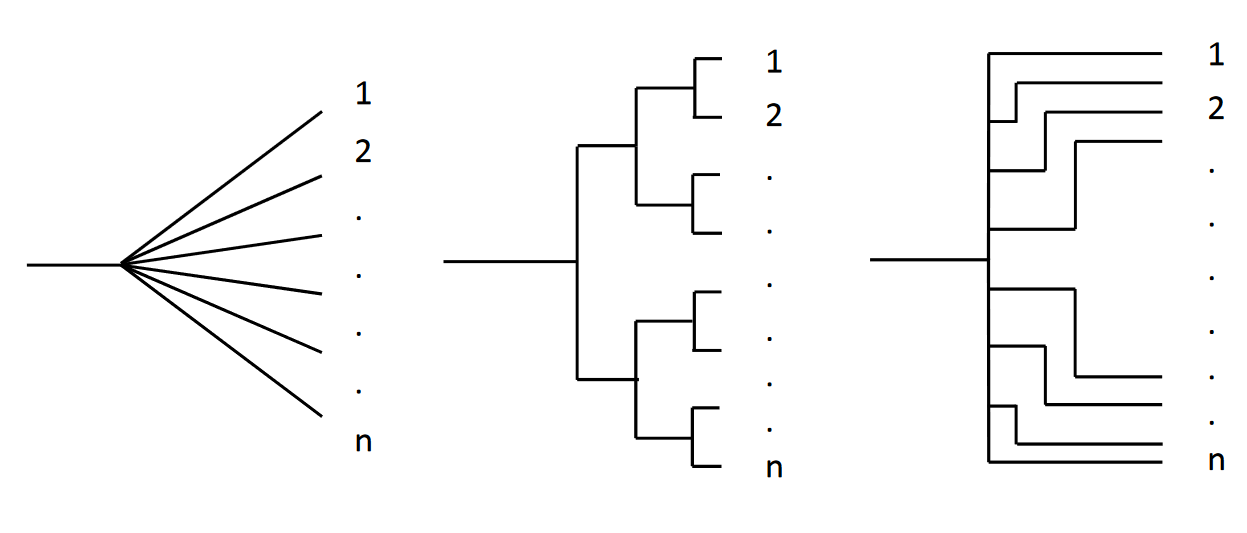 Längenbalancierte Verteilsysteme (rechts) können ebenfalls auf dem Umfang eines Zylinders eingefräst werden und bieten ähnliche Vorteile wie die 2 hoch n Verteiler. Das Funktionsprinzip dieser Vorverteilung wird an anderer Stelle noch einmal separat behandelt.