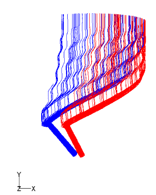 Together with the overall height of the system, the pitch angle determines the size of the wrap angle. The pitch angle, similar to a thread pitch, is the angle at which the spirals winds around the mandrel. The following figure shows the melt flow in two adjacent spiral in different colors. From the overall height of the manifold as well as the angle of inclination, the wrap angle results, in this case almost 180°.
