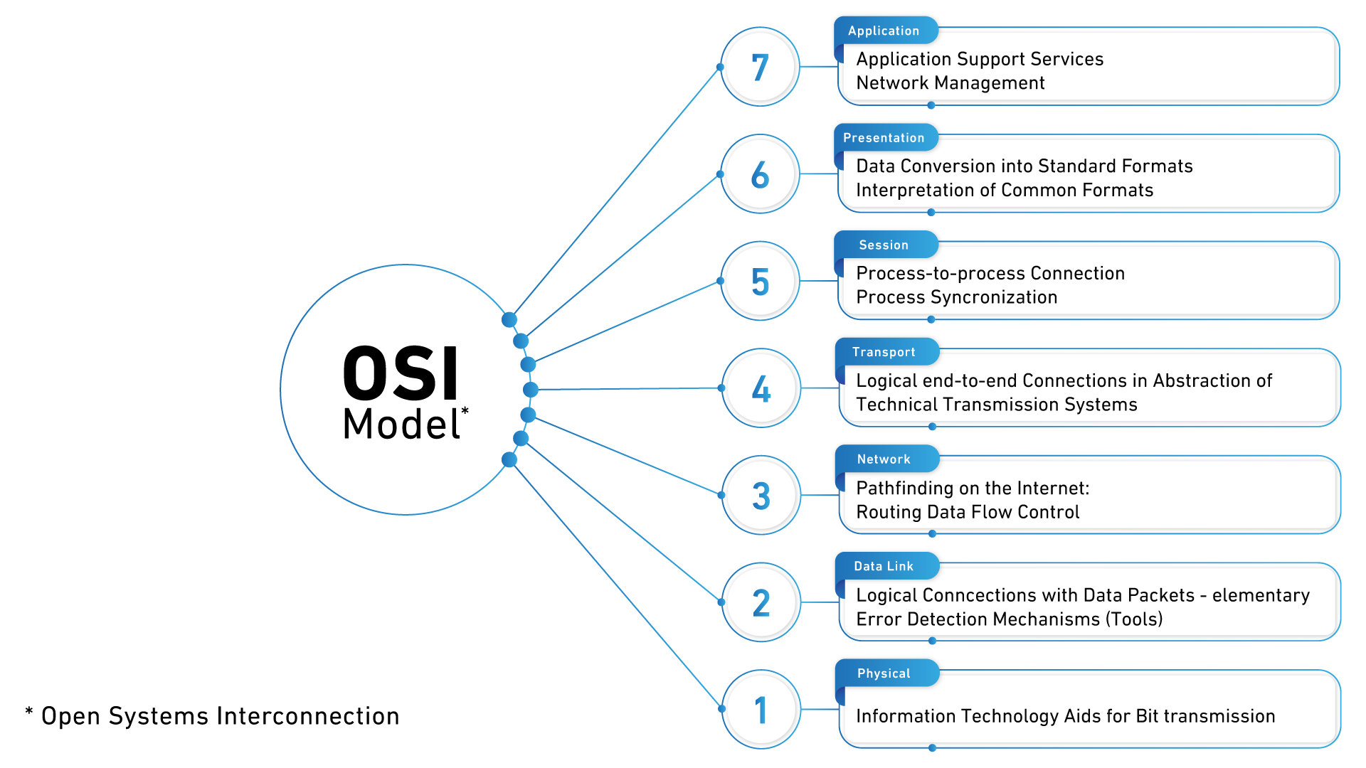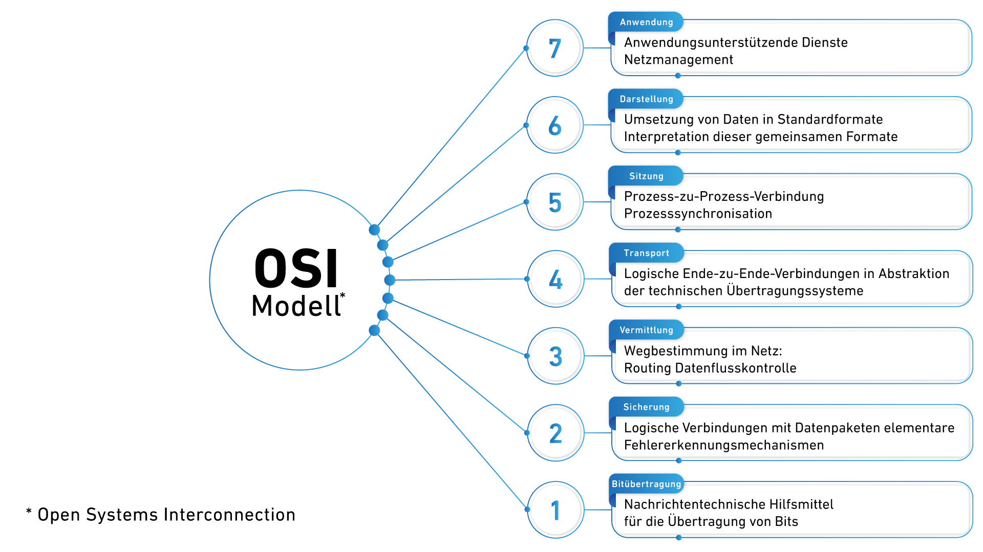 Das Basis Modell für nahezu jede Form der digitalen Datenkommunikation bildet das OSI Modell. Das OSI Modell wurde bereits 1984 eingeführt und unterteilt die Maschinenkommunikation in 7 hierarchische Ebenen. Für jede einzelne dieser Ebenen sind (verschiedene) Standards definiert. Das OSI Modell ist der bis heute gültige Standard zur Datenkommunikation in IT Systemen. Beim Versand einer digitalen Information durchlaufen die Daten hintereinander alle Stufen des OSI Modells von Stufe 1 bis Stufe 7 bzw. umgekehrt.