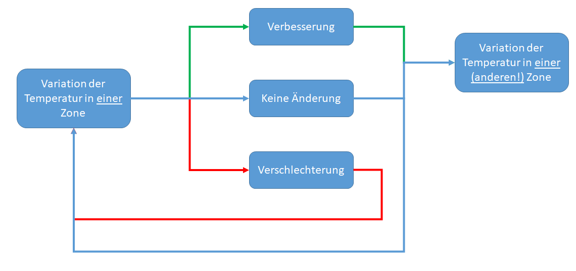 Aufgrund des Aufwandes eines DOE findet die manuelle Prozessoptimierung in der Praxis daher meist in der Form statt, dass einzelne Zonen (jeweils immer nur eine Zone) hinsichtlich ihrer Temperatur in kleinen Schritten (z.B. +/- 5°C) umparametriert werden. Nachdem das System eingeschwungen ist und wieder einen stabilen Betriebszustand erreicht hat, wird die Prozessqualität ausgewertet. Im Falle einer Verbesserung wird die Änderung angenommen, sofern keine Verbesserung eingetreten ist wird entweder die ursprüngliche Parametrierung wieder eingestellt und eine andere Zone wird variiert oder die Veränderung wird beibehalten und trotzdem eine andere Zone angepasst.