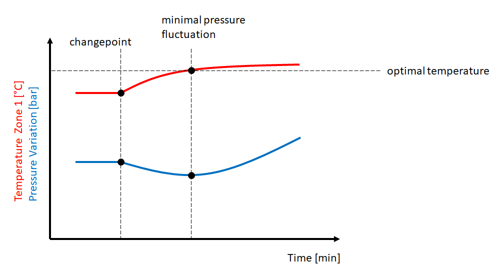 Another method for identifying an optimal temperature profile is dynamic optimization (e.g. according to Dr. Chris Rauwendaal). With this method, a significant change in a zone temperature (e.g. around 20-40°C) is set and the course of the temperature as well as the course of the target variable is recorded continuously (if possible automatically). Because a change does not occur abruptly, but the system slowly approaches the new target state, information is continuously generated that describes the behavior of the system.