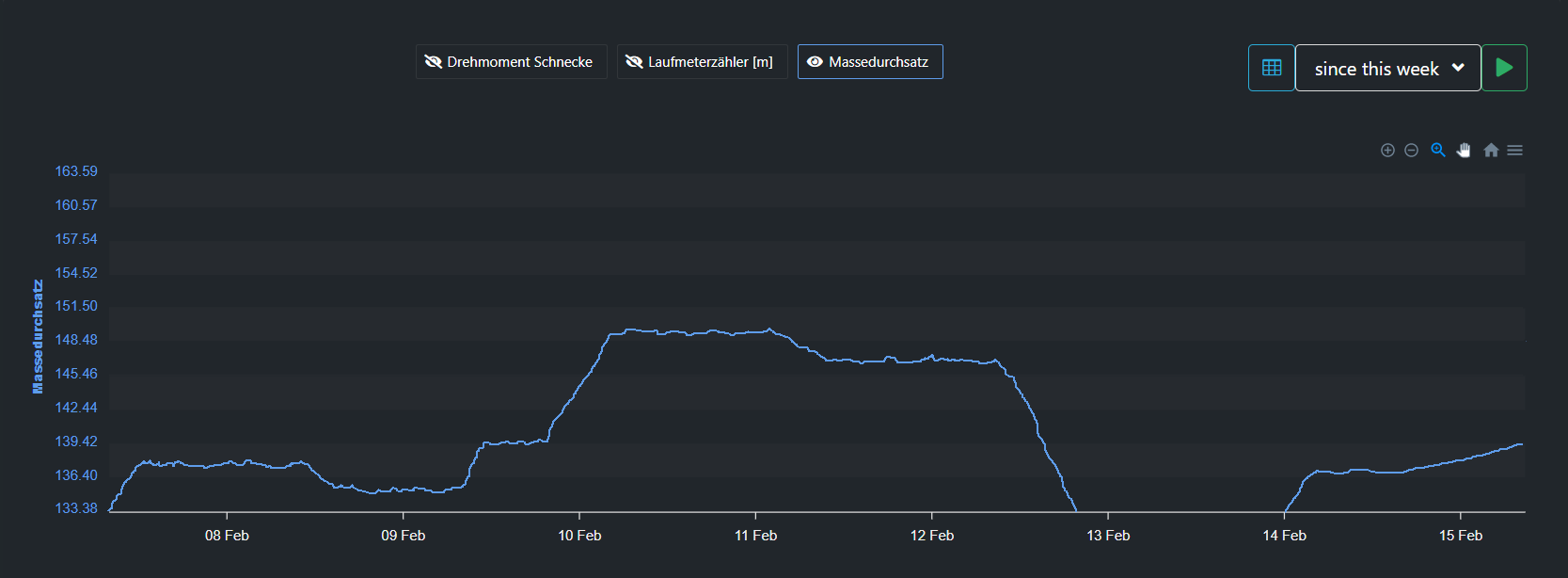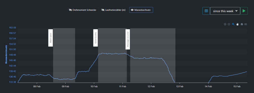 In order to analyze a curve like the one shown above, further records – for example the handwritten shift logs of the machine operators – are used, in which it can be found out that a production interruption occurred during the night from February 12 to February 13 due to a machine failure. However, there is no indication of the reduction in production speed during the night shift from February 11 to February 12, which makes this situation difficult to understand.