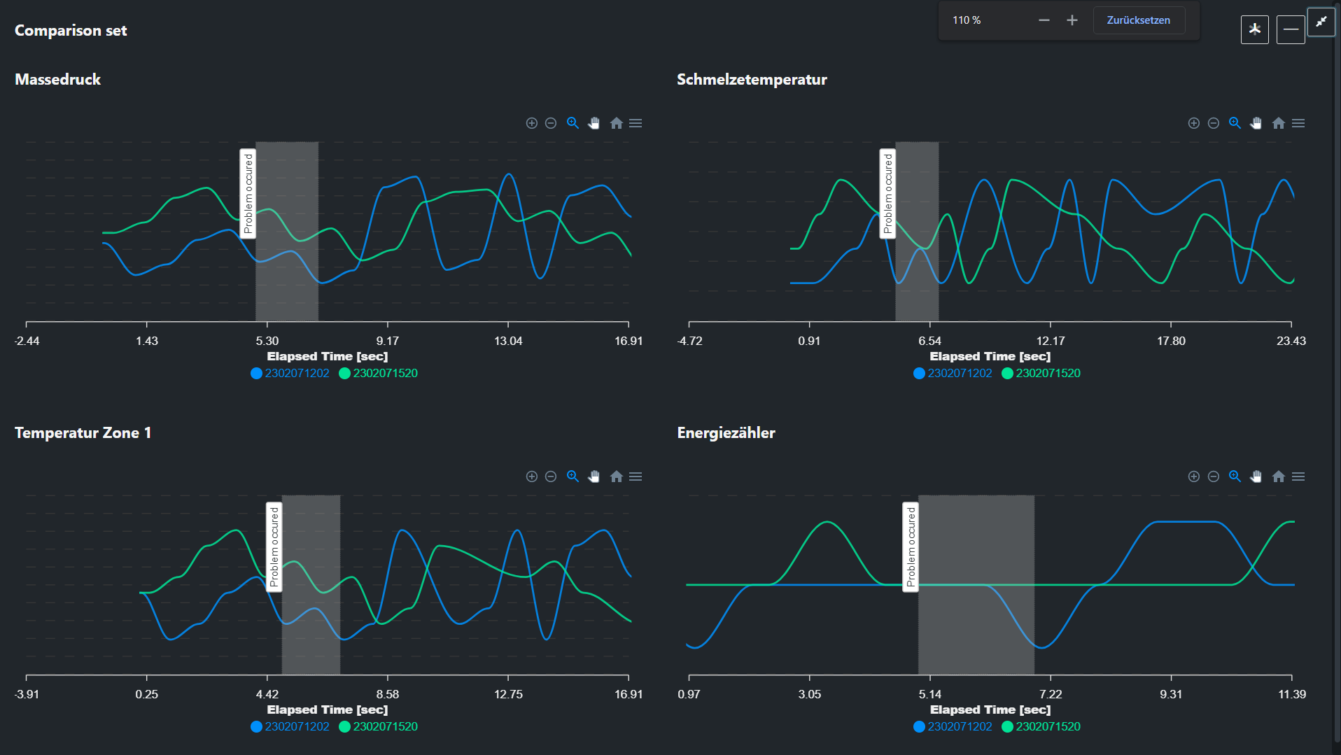 Rechts im Bild zu sehen: Für beide Zeiträumen, werden beliebige Detailkurven der Prozessparameter dargestellt und es werden Bereiche farblich markiert, die hervorgehoben werden (Problem occured). In der Kurvenscharanalyse lassen sich beliebige Situationen gegeneinander vergleichen.