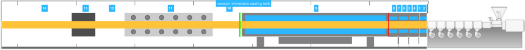 The profile is to be produced on an existing cooling line (see illustration). The calibration table is 6m long in total and can be flexibly equipped with several vacuum calibrations. A standardized length of 250mm each is taken as the individual length for hollow chamber profiles. Standard lengths are often used to optimize the manufacturing and setup process. The remaining post-cooling distance (immersion bath), when using four calibrations with 50mm length each, is thus approx. 5m.