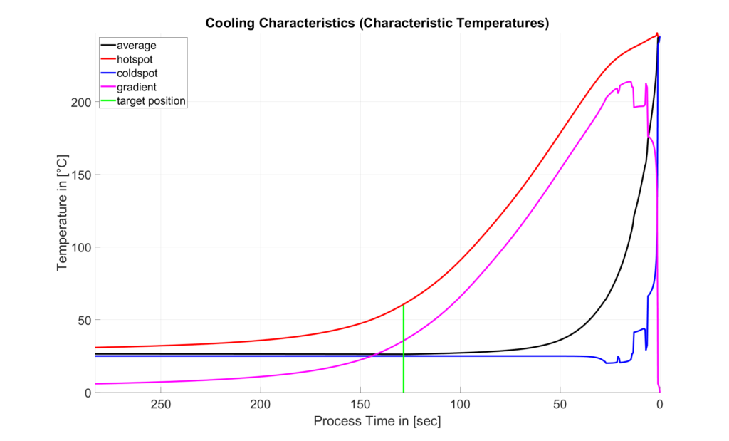 Eine wichtige Fragestellung zu Beginn des Auslegungsprozesse ist die realisierbare Produktionsgeschwindigkeit auf der Linie. Ein zentraler limitierender Faktor in der Kühlstrecke ist die Formstabilität des Profils nach der letzten Kalibrierung sowie im Abzug und in der Säge. Als kritischer Grenzwert wird beim vorliegenden Profil zunächst eine Hotspot-Temperatur von 60°C an den Innenstegen des Profils nach Verlassen des Kalibertisches und vor Eintritt in den Abzug definiert. Die Schmelzetemperatur (245°C) und die Kühlwassertemperaturen müssen vorgegeben werden. Die dann realisierbare Produktionsgeschwindigkeit wird mit einem Optimierer vollautomatisch exakt ermittelt. Im hier vorliegenden Beispiel wird unter den gegebenen Randbedingungen zunächst eine maximale Produktionsgeschwindigkeit von 3.0 m/min ermittelt. In der folgenden Abbildung werden die charakteristischen Temperauren über den gesamten Extrusionsprozess dargestellt. Die Position im Prozess, bei der die Zielgröße der Optimierung (Hotspot<60°C im gesamten Querschnitt) erreicht wird, ist mit der vertikalen grünen Linie markiert.