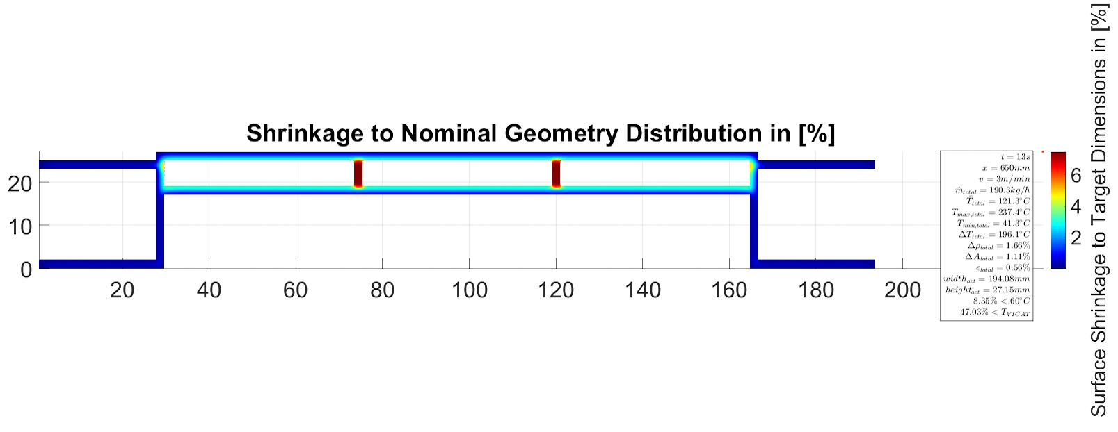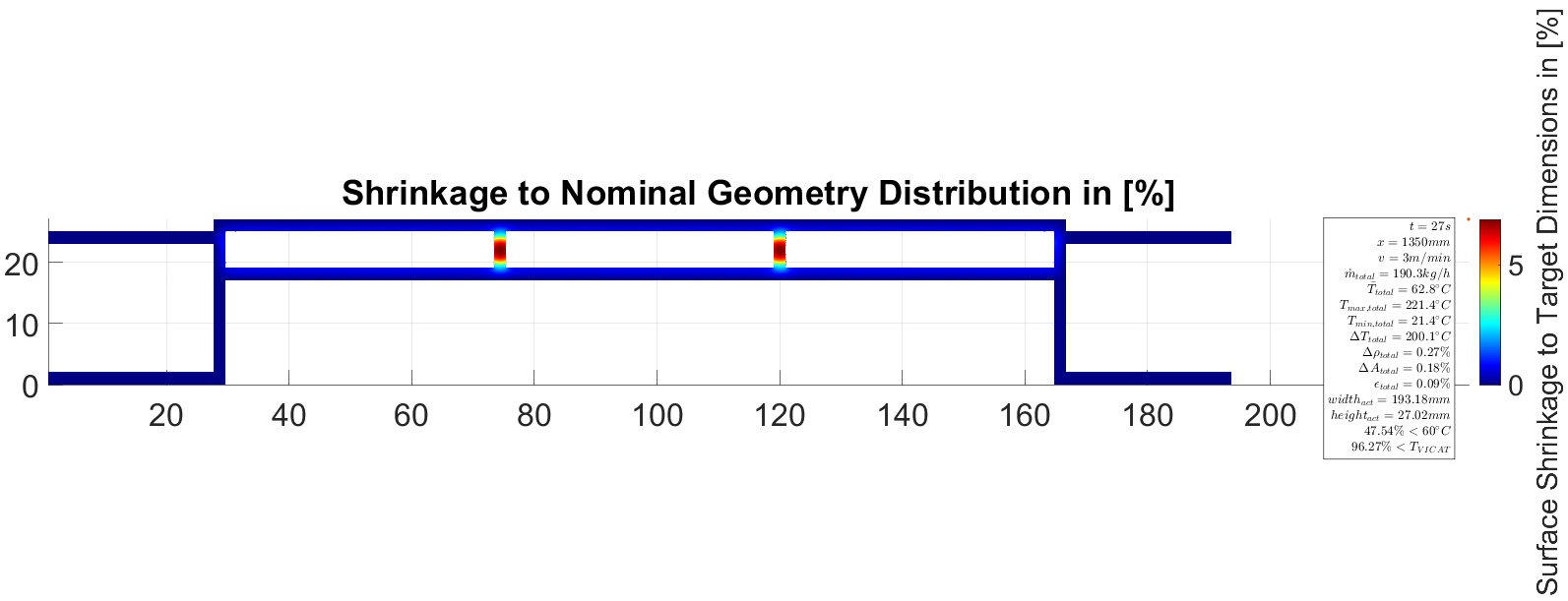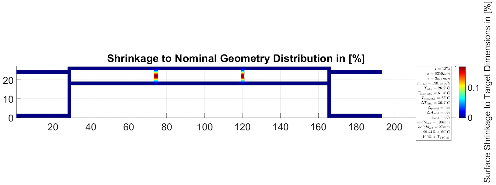 Insbesondere bei Hohlkammerprofilen kann die Kühlung und somit auch die Schwindung nicht an jeder Stelle im Prozess homogen realisiert werden. Dies hat zur Folge, dass einzelne Bereiche im Profil in der Auslegung unterschiedlich betrachtet werden müssen. Die in der folgenden Abbildung gezeigt Analyse der Schwindungsverteilung am Auslauf des zweiten Kalibers zeigt dies Inhomogenitäten anschaulich. Im Bereich der freien Stege in den Randbereichen verbleibt lediglich eine Schwindung von ca. 0,34% zum Nennmaß, im Kontrast dazu schwinden die Innenstege in den Hohlkammern noch ca. 7,5% in der Fläche und 3,7% in der Wandstärke. Die umlaufende Kontur schwindet noch ca. 1,4% in der Fläche und 0,65% in der Wandstärke.