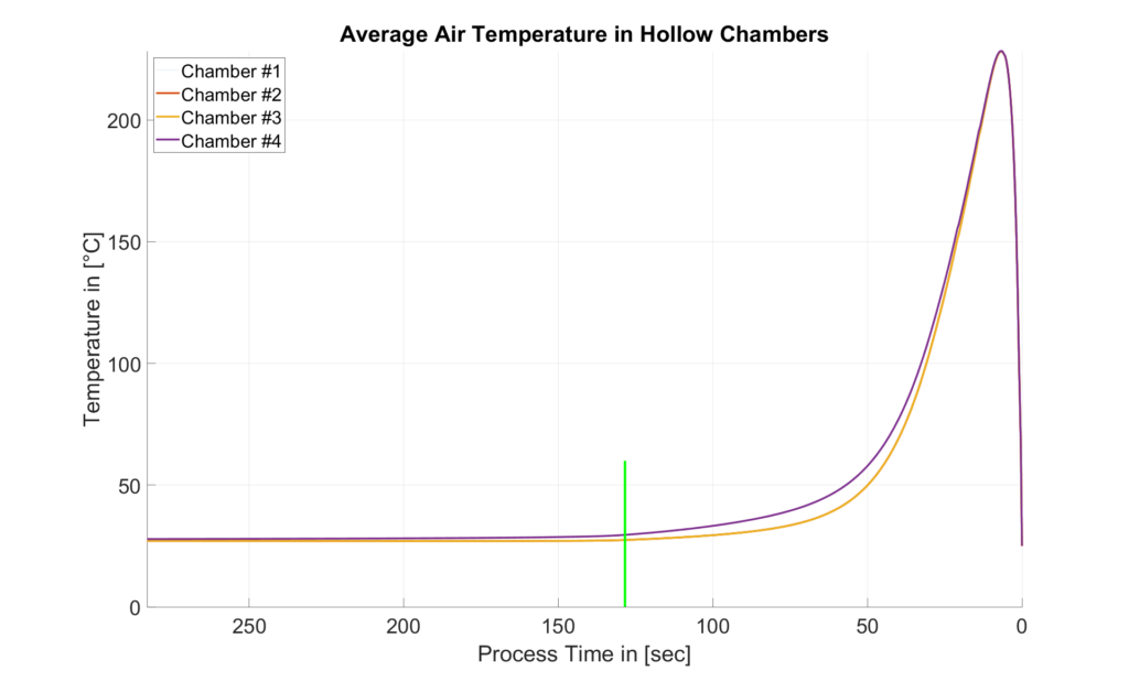 Eine Möglichkeit zur Reduzierung der Unterschiede ist die aktive Innenkühlung mit Luft, dieses Verfahren kann virtuell mit chillWARE® erprobt werden. Die in der folgenden Abbildung dargestellten Luftkammertemperaturen zeigen, dass die Lufttemperaturen zunächst sehr schnell die mittleren Innenwandtemperaturen in den jeweiligen Hohlkammern annehmen und dann langsam mit dem Profil abkühlen. Die Luft in den Hohlkammern wird über die kalten Profilaußenstrukturen gekühlt, die heißen Innenstege werden Ihrerseits dann von der Luft gekühlt. Dies hat zur Folge, dass die Luft in der mittleren Hohlkammer länger auf einem höheren Temperaturniveau verbleibt, da hier nur von zwei und nicht von drei Seiten gekühlt wird. Um diese Inhomogenität zu beseitigen, kann in die mittlere Kammer ein aktiver Kühlluftvolumenstrom eingebracht werden.