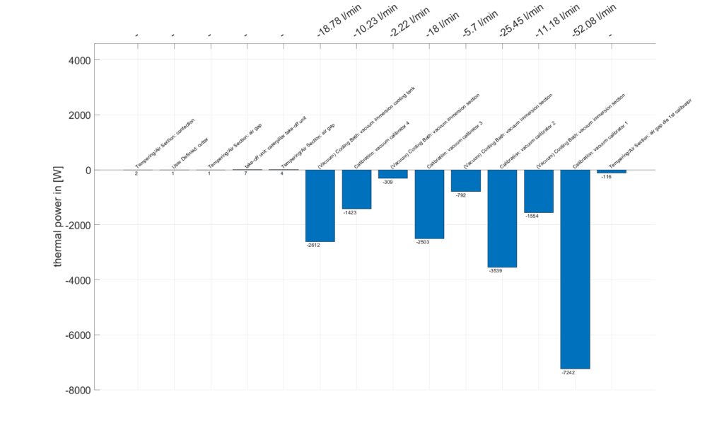 Die abzuführenden Kühlleistungen und die – auf einer Basis von einer Temperaturdifferenz von Vor- zur Rücklauf in Höhe von 2°C – resultierenden notwendigen Wasservolumenströme werden im folgenden Diagramm zusammengefasst. Grundsätzlich ist in der Profilextrusion zu beobachten, dass die höchste thermische Leistung bereits in der ersten Kalibrierung abgeführt wird. Im hier vorliegenden Fall sind es 7,2 kW der insgesamt abzuführenden 21,8 kW. Um diese hohe thermische Leistung abzuführen, ist es notwendig den ersten Kaliber mit einer konturnahen Kühlung und einem Wasserdurchfluss von 52 l/min auszustatten.