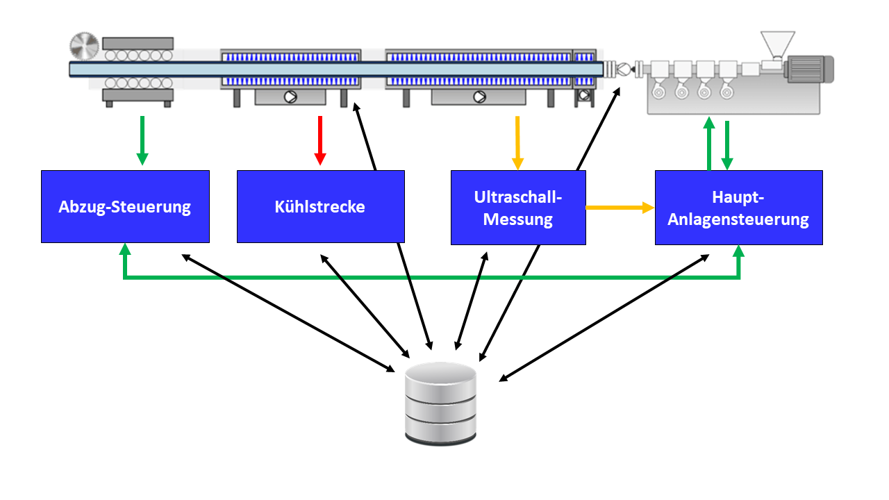 In Extrusionslinien (z.B. Rohr, Profi, Vollstab, Platte) oder Extrusionsanlagen (Blasfolie, Blasformen) existieren in den meisten Fällen neben der eigentlichen Hauptanlagensteuerung weitere Systeme und Sensoren die über eigene Steuerungen verfügen. Dies kann bereits eine einfache Regelung eines Temperiergerätes sein oder eines Abzuges/Wicklers, aber auch die Steuerung einer Millimeterwellensensorik oder einer Gravimetrie. In manchen Fällen verfügen diese dezentralen Steuerungen bereits über Schnittstellen so dass eine Kommunikation mit der Haupt-Anlagensteuerung möglich ist. In anderen Fällen arbeiten derartige Systeme völlig autark, ohne dass die Haupt-Anlgensteuerung Informationen aus diesem Subsystem bereitgestellt bekommt.