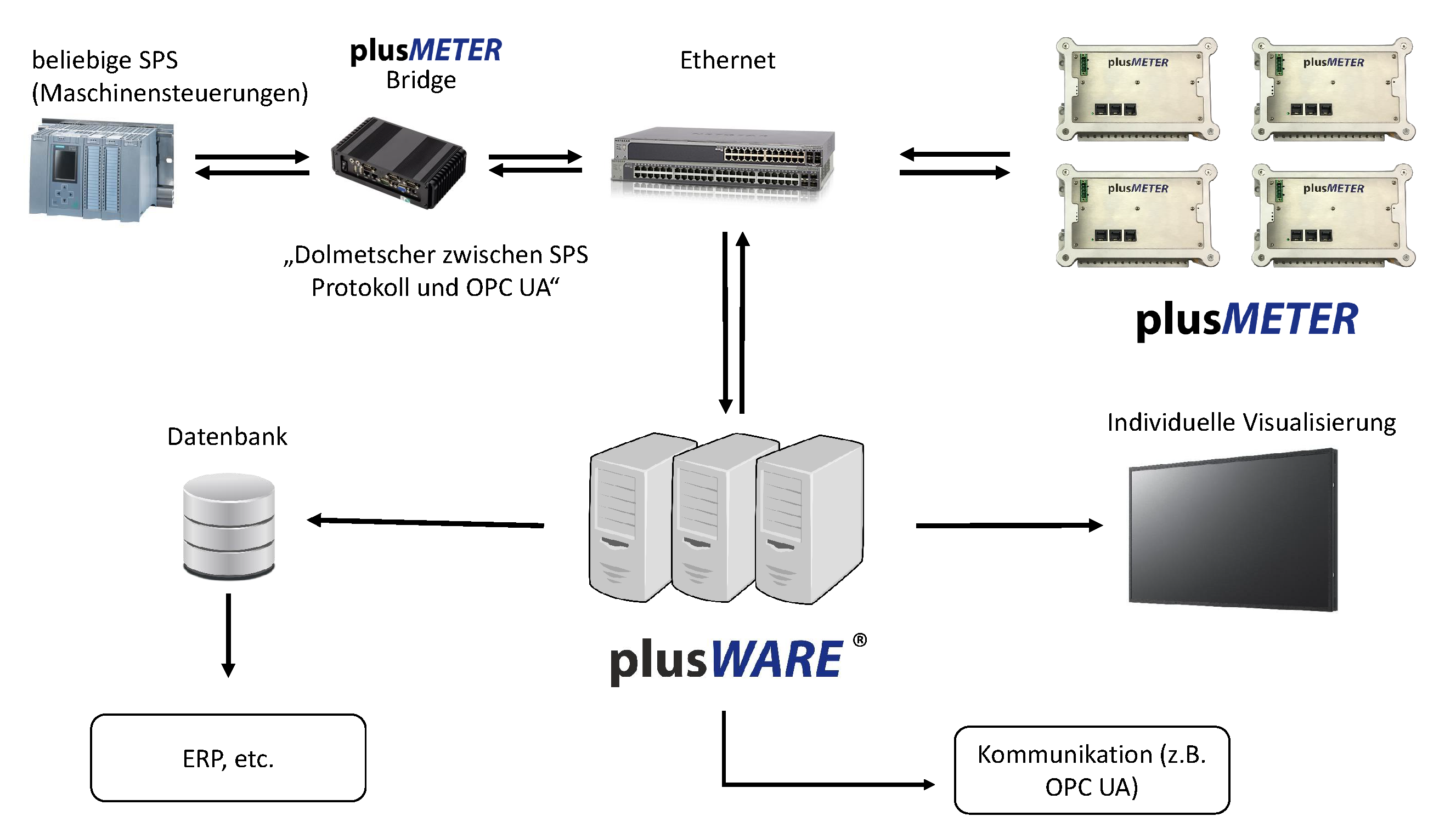Zunächst wird die Maschinensteuerung der Hauptanlagensteuerung betrachtet. Hier laufen bereits viele verschiedene analoge Signale auf und werden in dieser SPS in digitale Signale umgewandelt. Die Maschinensteuerung (in diesem Fall vom Hersteller Siemens) bietet die Möglichkeit der Kommunikation über das ProfiNET Protokoll via Ethernet Schnittstelle. Damit die in der Maschinensteuerung zur Verfügung stehenden Informationen ausgelesen werden können, wird ein Dolmetscher eingesetzt (in diesem Fall eine plusMETER Bridge) die im Netzwerk einerseits die Kommunikation zur Maschinensteuerung (in der Sprache ProfiNET) herstellt und gleichzeitig mit anderen Systemen in der Sprache (OPC UA) kommuniziert, sowie eine Datenbank im Standardformat MS SQL schreibt. Somit stehen nun sämtliche Informationen, die die Maschinensteuerung kennt sowohl über die Sprache OPC UA zur Verfügung, als auch als digital gespeicherte Information in einer SQL Datenbank vor.