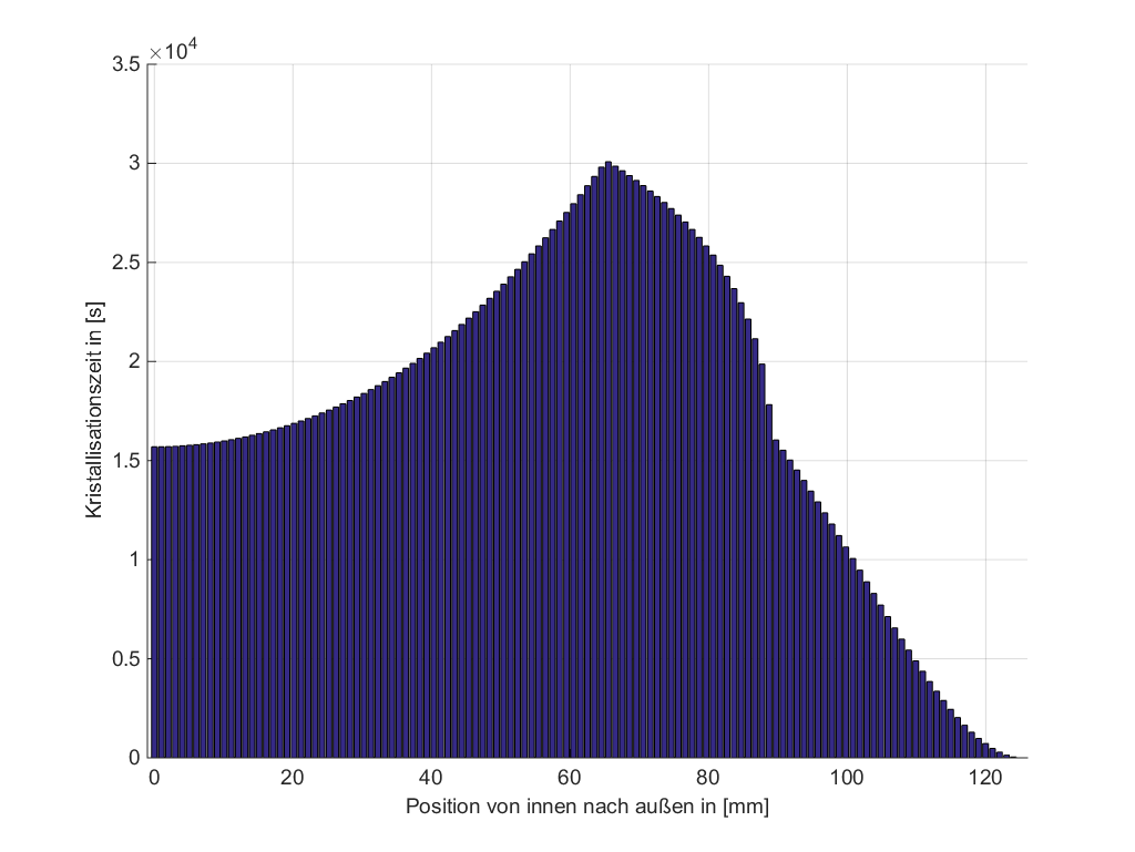 Auf der Ordinate (Y-Achse) wird der für die jeweilige radiale Schicht gültige Zeitraum in Sekunden dargestellt, wie lange an dieser radialen Position der Temperaturbereich vorlag, in dem Kristallisation möglich ist.