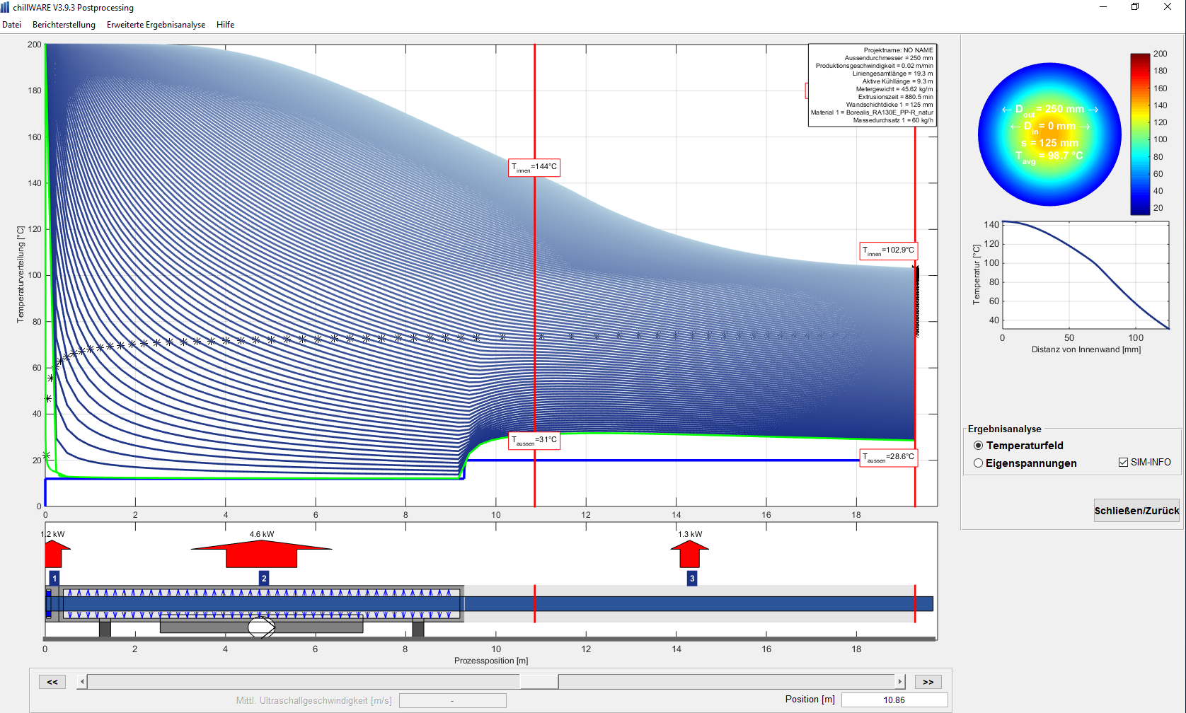 Das nachfolgend abegildete Simulationsergebnis eines 250mm Vollstabes aus PP zeigt, dass selbst nach 20m Kühlstreckenlänge (880min Extrusionszeit) der Kern des Materials noch eine Temperatur von mehr als 100°C aufweist. Gleichzeitig ist die Außenwandtemperatur bereits auf 28°C abgekühlt und somit vollständig erkaltet und formstabil.